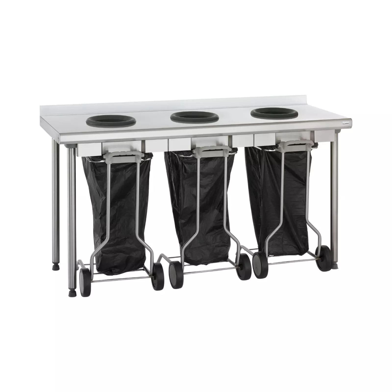 Table murale en inox équipée de 3 trous vide-déchets avec collerettes en caoutchouc (Ø 19 cm intérieur). Elle est livrée avec 3 porte-sacs de 80 cm de hauteur et dispose d’un dosseret de 100 mm, pour une utilisation pratique et adaptée aux environnements professionnels.Caractéristiques :